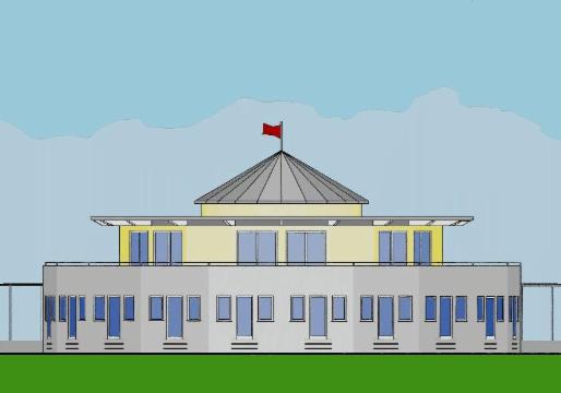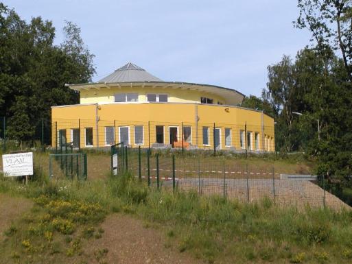 Besonderheit: Baukörper als halbes 20-Eck, mit großen Außengehegeflächen. Das Ober- geschoss wird von einer 4 m breiten, umlaufenden Dachterrasse erschlossen Der Turmraum dient auch als Podium bei Veranstaltungen und ist zusätzlich von oben über eine Lichtkuppel beleuchtet.