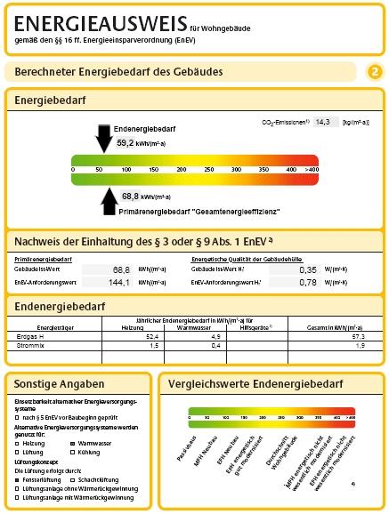 Der nach der EnergieEinsparVerordnung (EnEV 2007, gültig bis 30.09.2009) berechnete und für Neubauten maximal zulässige Wärmeverlust durch die Gebäudebauteile, wurde um 55 % unterschritten. Das Gebäude fällt somit in die Kategorie:
