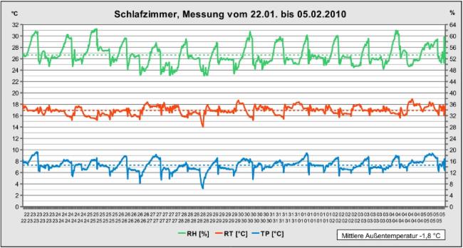 Man kann am Verlauf der grünen Kurve (Werte der relativen Luftfeuchte) gut erkennen, wann gelüftet wurde.